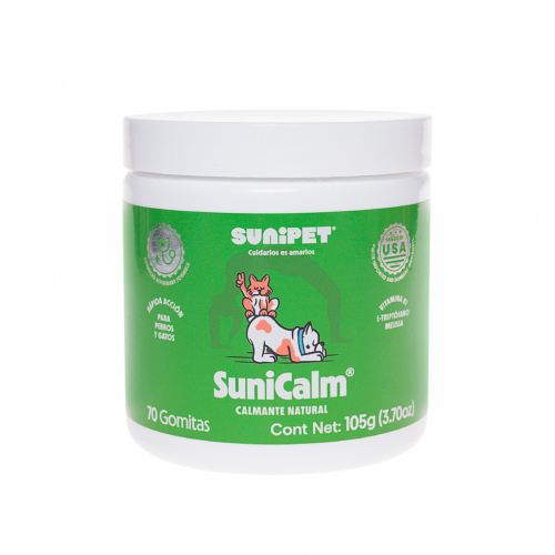 Calmante natural que ayuda a reducir cuadros de estrés en mascotas sin sedarlos gracias a la Tianina, L-triptófano y Melissa. Natural y libre de fármacos. Apto para mascotas con alergias alimentarias. Su formato en gomita facilita la administración en perros y gatos.